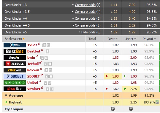 Over ở Sbobet 1.93: đánh 54usd , nếu thắng 54*1.93 = 104.22 usd > 100usd vốn