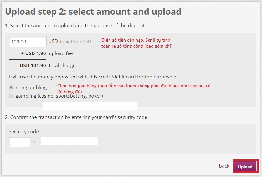 Trường hợp nạp tiền từ thẻ vào skrill (upload funds):