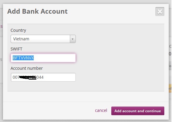 Nhập số tài khoản ngân hàng vào ô "Account number". Nhấn "Add account and continue"