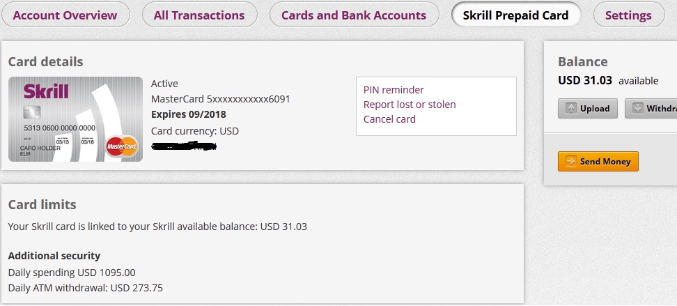 Khi có Prepaid MasterCard, tài khoản skrill sẽ có thêm một mục "Skrill Prepaid Card", người dùng có thể vào đó để xem thêm thông tin. Hạn mức rút tiền mặt tại ATM của thẻ này không được nhiều, chỉ 250Eur / ngày.