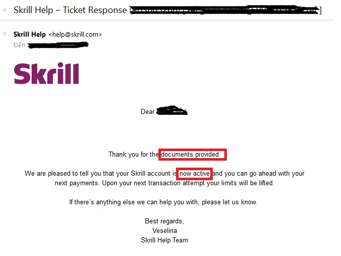 Người dùng chỉ cần thao tác theo các yêu cầu từ skrill. Sau khi được nhân viên skrill xét duyệt, họ sẽ mở khóa tài khoản cho người dùng và email thông báo thành công.