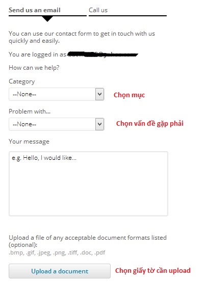 Điền vào form liên lạc với skrill, chọn các mục và vấn đề liên quan, upload các giấy tờ được yêu cầu.