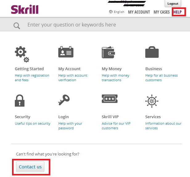 Đăng nhập vào tài khoản skrill, ở phần "Help", vào "Contact Us".